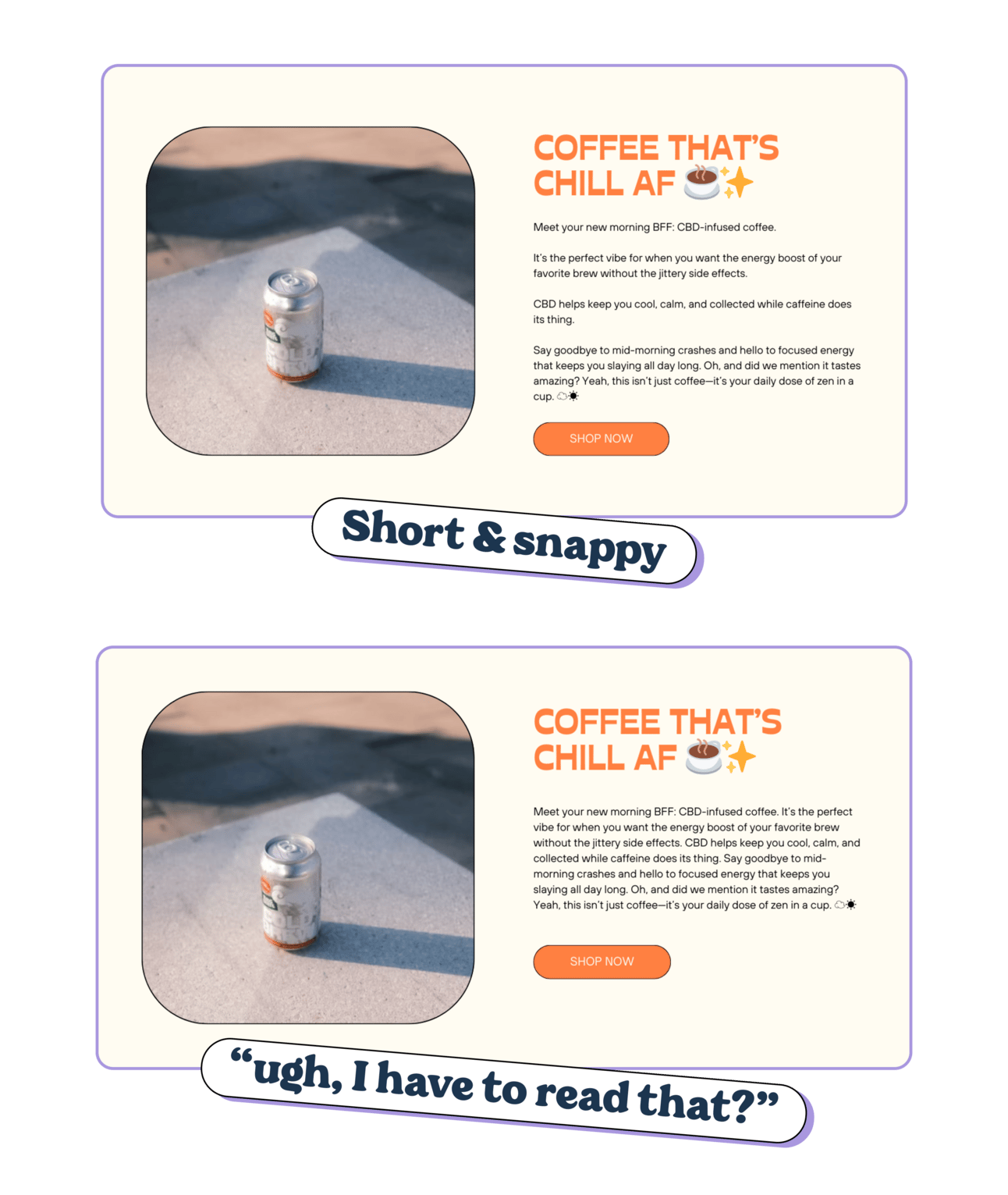 👉 Embrace the line break: Got a longer sentence that feels important? Give it room to breathe by dropping it onto its own white line. (This also adds white space, which customers love.)