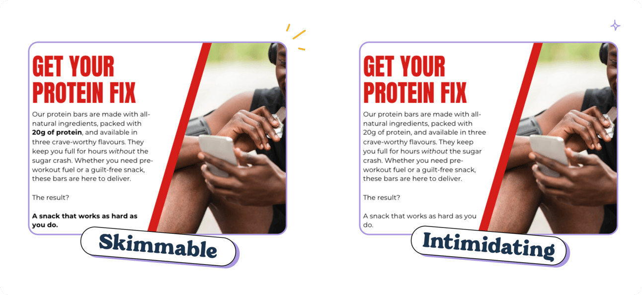 👉 Proofread like a skimmer: When you’re reading your copy, do the first read-through as a skimmer. Just take a cursory glance at the copy and see what catches your eye. Does it feel like “ugh, I have to read that?”. If so, break it up some more.